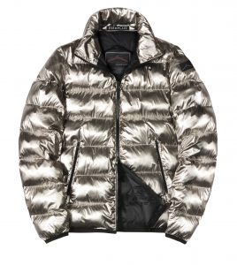 Puffy jacket in nylon ultra-light spalmato argentato. Imbottitura con innovativa piuma sintetica alternativa ECODOWN FIBERS – 100% riciclata da bottiglie di plastica.