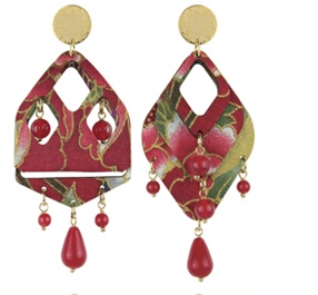 Orecchini asimmetrici realizzati con sete di antichi kimono stesi su pelle, abbinate a pietre colorate e montati in ottone galvanizzato oro