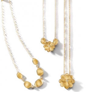 e racchiuse da un filo d’oro lucido a contrasto, creano icastiche corolle che si schiudono fino a svelare un pistillo in oro o diamante. I fiori così ottenuti planano dolcemente su bracciali e collane, anelli e orecchini componendo dei piccoli bouquet armoniosi e piacevolmente femminili.