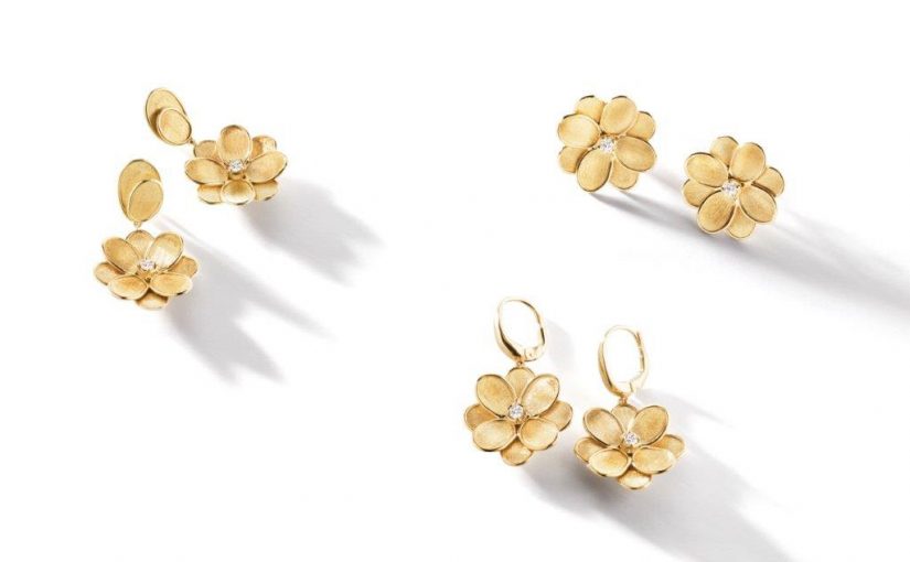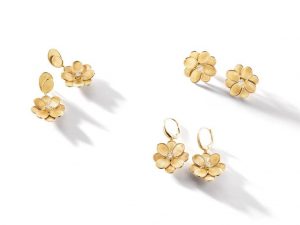 Deliziosi fiori dorati reinterpretano l’iconica Collezione Lunaria conferendo ai gioielli un sapore romantico e naïf. I petali, ottenuti da sottili foglie d’oro giallo incise a mano con la caratteristica tecnica del bulino