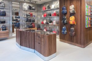 Il nuovo store concept del flagship, ideato da Storage Milano ha l’obiettivo di riflettere, nell’involucro che ospita i prodotti Piquadro, i valori distintivi che ispirano il marchio: il design, la funzionalità e l’innovazione tecnologica da un lato e l’artigianalità italiana, la qualità dei pellami pregiati e la cura per i dettagli dall’altro. Il risultato è un’atmosfera lifestyle all’interno di un ambiente pulito e dai toni caldi ed emozionali. Lo studio di geometrie lineari, sottolineate dalla luce, permette di sviluppare una quinta scenica forte pur mantenendo un’esposizione immediatamente leggibile e ordinata. I materiali utilizzati non sono solo contemporanei e ricercati, ma anche basici, autentici ed essenziali. Il legno di noce canaletto cannettato e liscio, contrapposto all’alluminio satinato a mano e anodizzato, crea degli scenari differenti e in contrasto che esprimono un forte carattere ma che allo stesso tempo dialogano armonicamente tra di loro. Il valore aggiunto è nei processi di lavorazione artigianale a cui sono state sottoposte le finiture utilizzate, andando anche qui a far coincidere la filosofia del brand con quella dell’involucro che va ad ospitarlo.