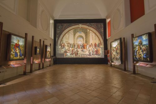 Una carriera folgorante quella di Raffaello, morto a soli 37 anni, che la mostra racconta affiancando riproduzioni di opere provenienti dai maggiori musei del mondo – dagli Uffizi di Firenze, ai Musei Vaticani, dalla Pinacoteca di Brera a Milano alla Galleria Borghese a Roma, passando per il Louvre a Parigi, il Prado a Madrid e la Gemäldegalerie a Berlino, per arrivare a San Pietroburgo all’Ermitage e alla National Gallery di Washington, solo per citarne alcuni – che conservano capolavori assoluti come la Madonna Conestabile, la Madonna di Terranuova, lo Sposalizio della Vergine, la Madonna del Cardellino, la Deposizione, il Ritratto di Baldassare Castiglione e tanti altri fino ad arrivare alle Stanze Vaticane per cui Raffaello giunse a Roma ingaggiato da papa Giulio II che segnò la sua consacrazione a interprete della ”maniera moderna”.