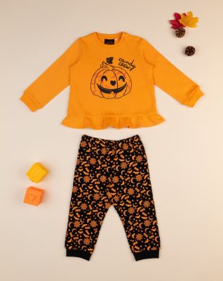 Per i bambini più grandi, 9 mesi – 6 anni, la collezione diventa più vivace e “spaventosa”! Le opzioni includono un pigiama nero a maniche lunghe con una stampa coordinata, dotato di pratici bottoni automatici e pantaloni bianchi e neri con disegnini allover in tinta. Nella versione femminile, la proposta si compone di una maglia a maniche lunghe arancione, impreziosita da una zucca stampata e bottoni automatici, abbinata a pantaloni neri con una fantasia allover di piccoli disegni in tinta. La vestibilità di entrambi i modelli è morbida e regolabile, grazie all’elastico in vita, per il massimo del comfort durante la notte.