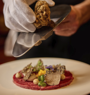 Acanto, il ristorante all’interno del prestigioso Hotel Principe di Savoia Dorchester Collection, celebra il Tartufo Bianco d’Alba, Chiaro di Alba®, con una serie di proposte firmate dallo Chef Matteo Gabrielli, in cui la materia prima è protagonista assoluta. L’offerta consta di quattro portate – “Tartare di Fassona Piemontese”,“Tagliolini ‘oro’”, il celebre “Risotto ‘Gran Riserva Gallo’”, “Uova al tegame” e una sorprendente “Crème brûlée” – tutte arricchite dal tartufo bianco d’Alba, il cui aroma intenso avvolge e trasforma ogni piatto in un’esperienza sensoriale unica. Per esaltare e completare il percorso gastronomico, i sommelier consigliano gli abbinamenti con Barolo Sarmassa Marchesi di Barolo o con Duemani Cabernet Franc.