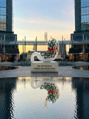 L’installazione si presenta come una forma monumentale, imponente, che occupa lo spazio con una presenza silenziosa ma intensa. La superficie dello stomaco è attraversata e ricoperta da una moltitudine di farfalle, elemento naturale e fragile, che introduce un contrasto visivo e concettuale con la solidità della struttura anatomica. Le farfalle, con i loro colori vibranti e il loro movimento, diventano il segno visibile di uno stato interiore: l’innamoramento.