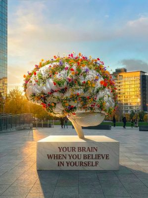 L’opera Your Brain When You Believe in Yourself si inserisce nel filone dei “Cervelli del corpo umano”, ponendo il cervello come protagonista assoluto di una riflessione che intreccia dimensione interiore, consapevolezza e relazione con la natura. L’installazione, di grandi dimensioni, si impone nello spazio con una presenza monumentale: non solo per la scala, ma per la forza simbolica che emana.